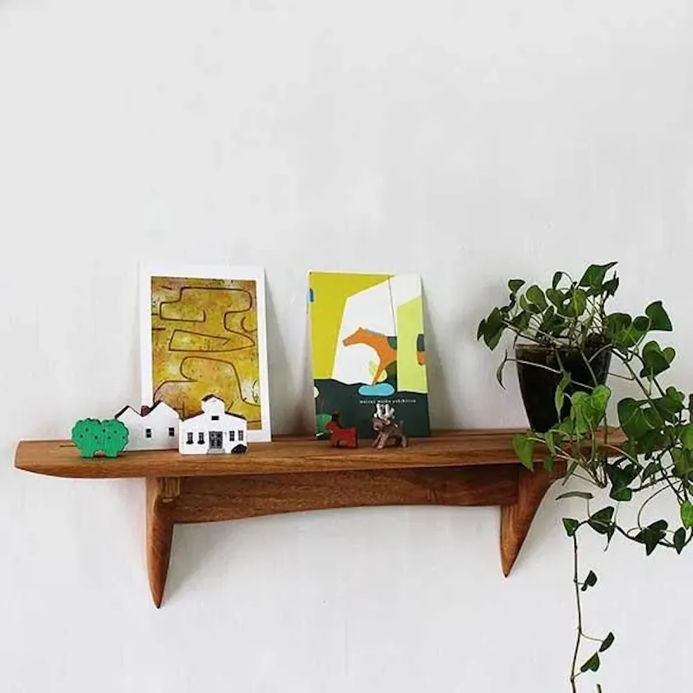 小さな雑貨やミニグリーン、ポストカードを飾るのにちょうどいい奥行きがあり、棚自体がインテリアの主役になるよう、細部のデザインにもこだわっています。