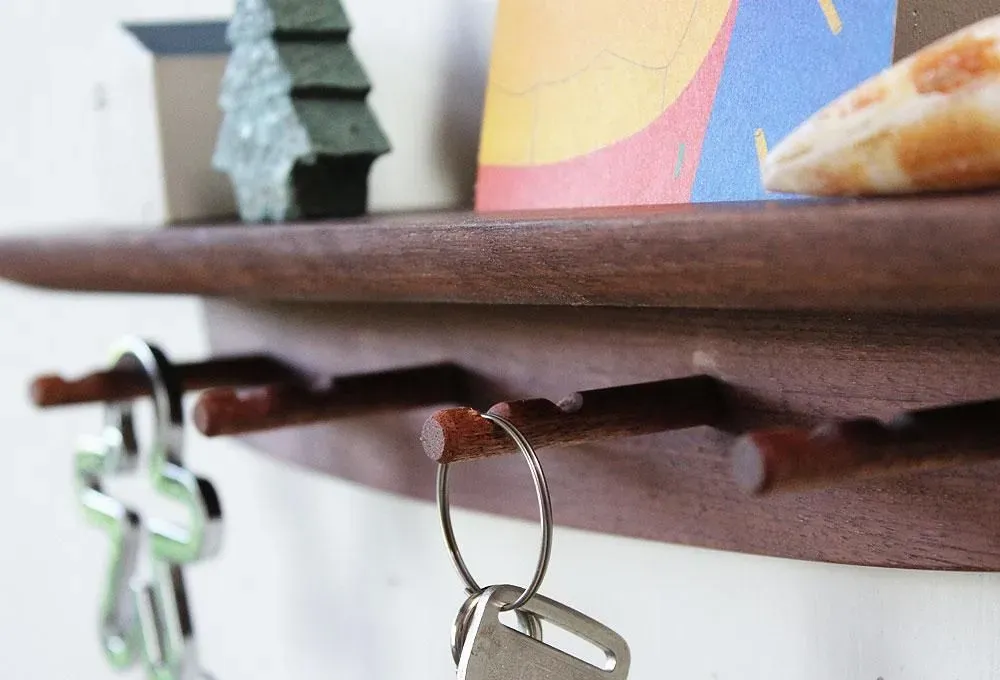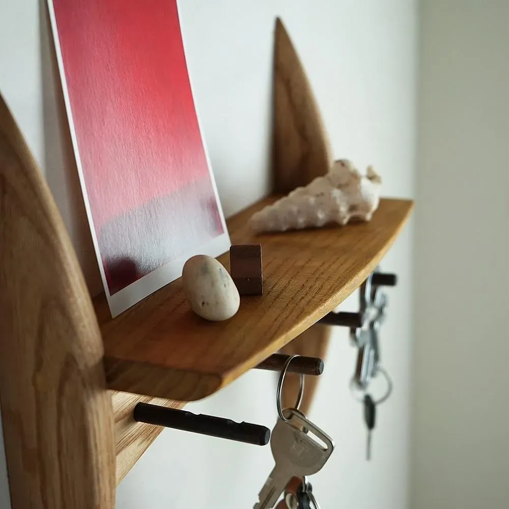 棚下にはフック1本あたり鍵を2本掛けられる仕様で、合計8本の鍵がかけられる玄関に最適なウォールシェルフです。